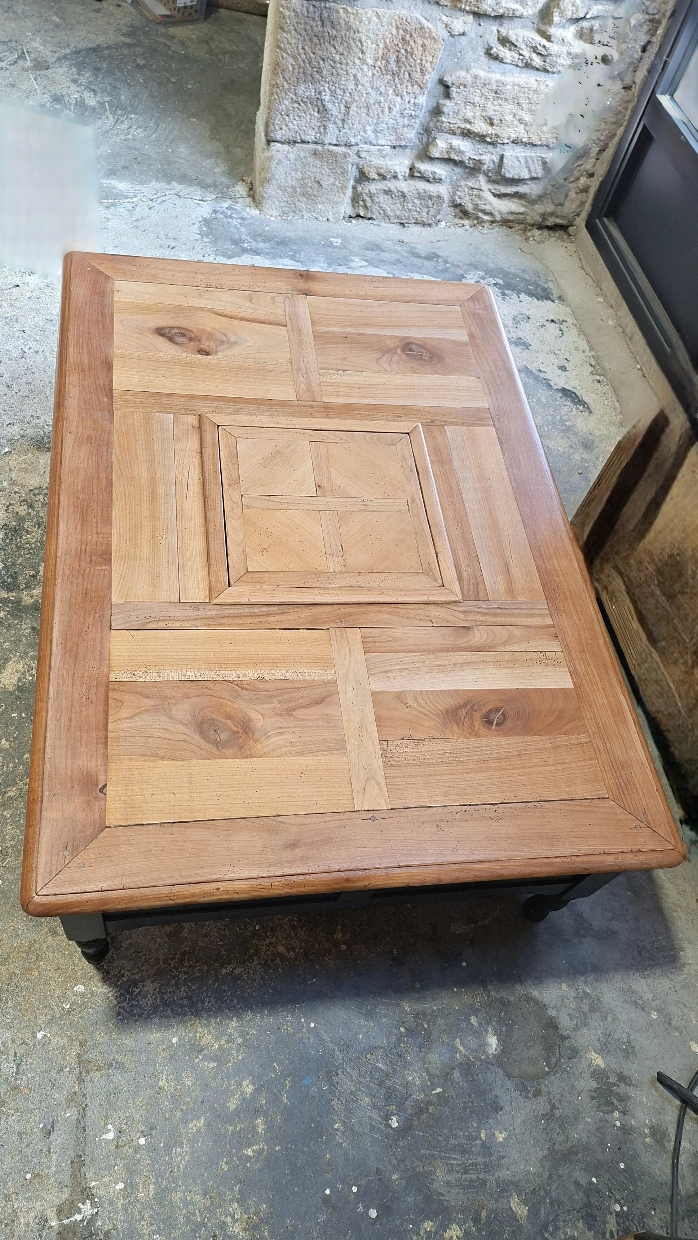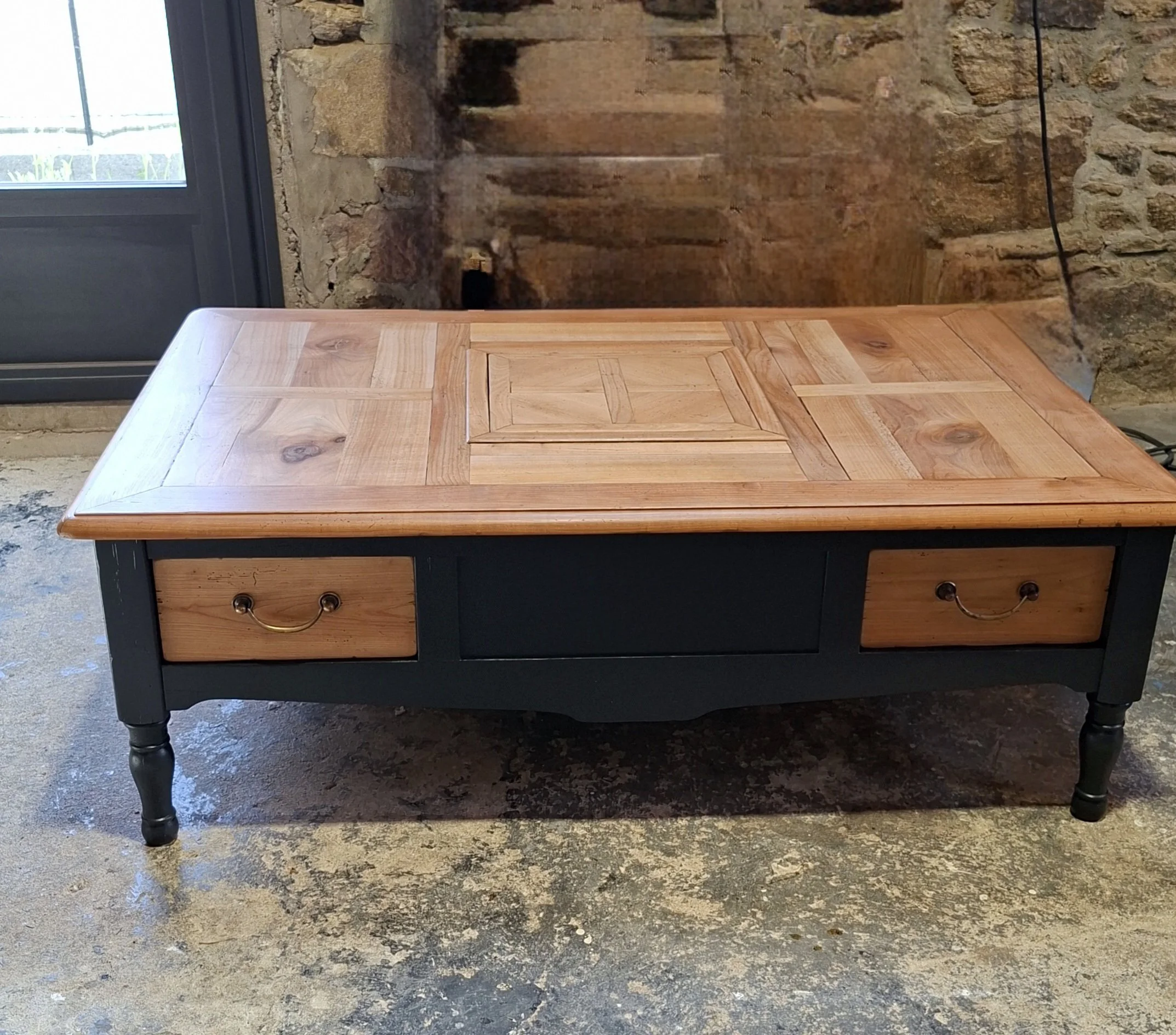 Plateau et tiroirs bois pour garder le coté chaleureux de la table, en contraste avec les pieds et le soubassement noir!
