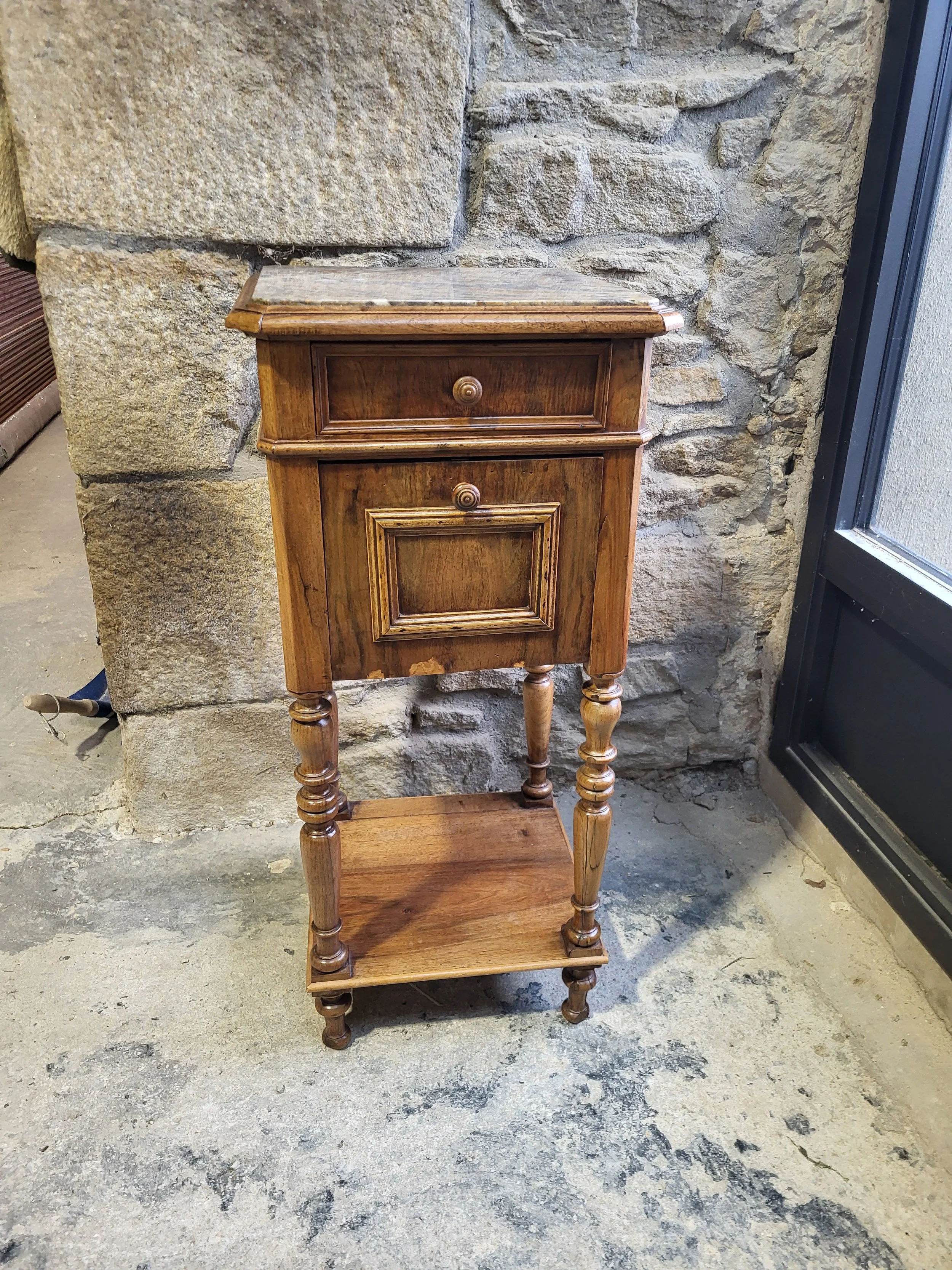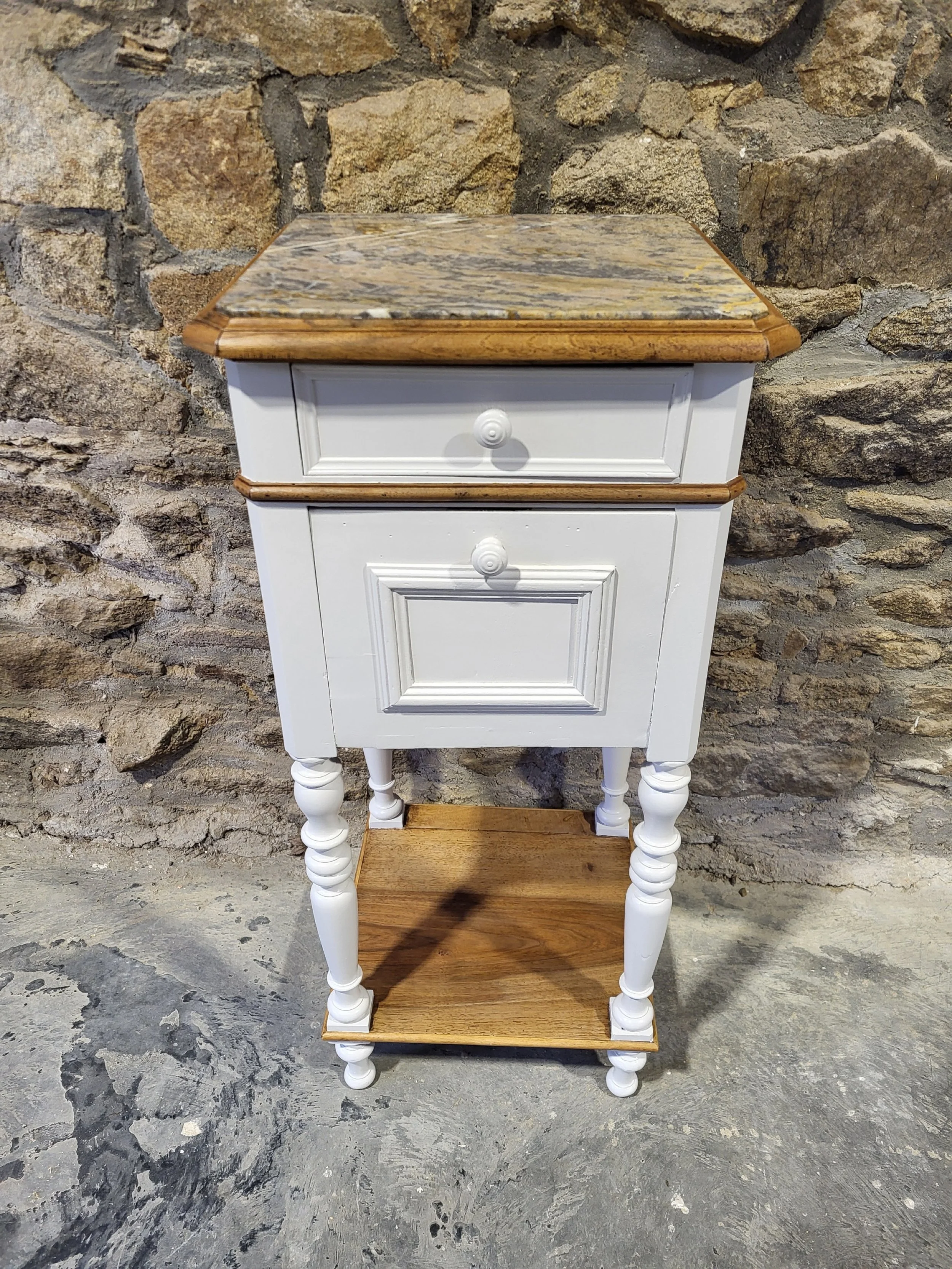 Dessus en marbre et bois de noyer. Ponçage, recollage et remplacement de placage, mise en peinture et protection des parties bois par vernissage.